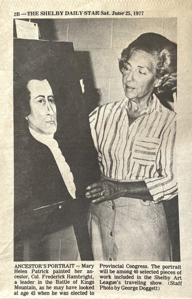 Mary Helen Hambright Patrick, 1922-2006. An accomplished visual artist herself, she was also a patron of the arts, serving eight years on the Board of Directors of The Shelby Art League and the Board of Directors of the Kings Mountain Little Theatre in its early years.