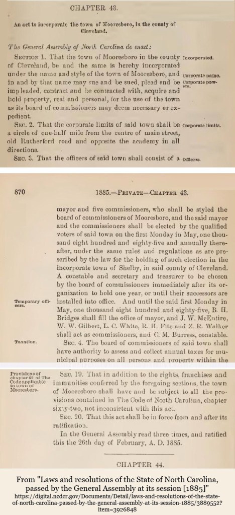 Mooresboro’s first town commissioners were J. W. McEntire, W. W. Gilbert, L. C. White, R. H. Fite, and Z. R. Walker. C. M. Burress (Burrus) was town constable. C. M. Burrus was Charles Miles Burrus, a sister to Martha Burrus Bland. The family connections can be found here.