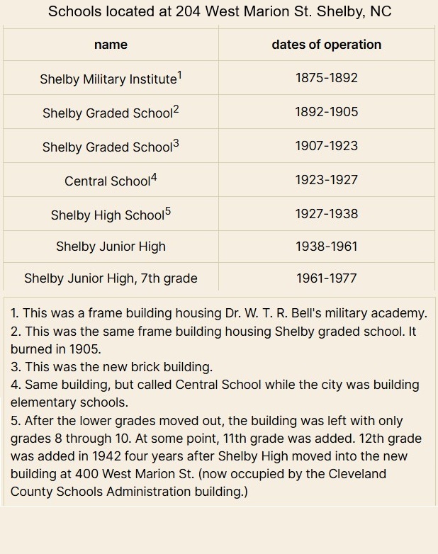 Extinct Schools: Beaverdam, Sharon, and Shanghai (merged in 1936, retaining the name Shanghai), Cleveland Female Academy (1874-x), Cleveland Training School (1st, 1895-1920; 2nd, 1920-1926(destroyed by fire); 3rd, 1927-1977), Dover (x-1991), Hopewell, Graham, 1st (1927-1956); converted to Oak School (6th grades only), Graham, 2nd (1956-2022), Hunter (1957-1969), Lafayette (1923-1956), Jefferson (on Buffalo St. 1920s-1969), Marion (on Marion St., 1923-1951)), Marion (on Forest Hill Dr. (1951-2022), Morgan (x-x), Northside (Children’s Center, North Shelby (1st)), Roberts Seminary (1863-x), Rock Cut, Shelby Academy, Shelby Cotton Mill School (1915-replaced by Morgan School), Shelby Military Institute (1887-1892); (Shelby Graded School (1892-1905); Shelby Graded School (1907-1923); Central School (1923-1927), Twelve Oaks Academy, (1979-2007), Washington Elem. (on N. Lafayette St. (1950s-1979)), Zion (Church) School