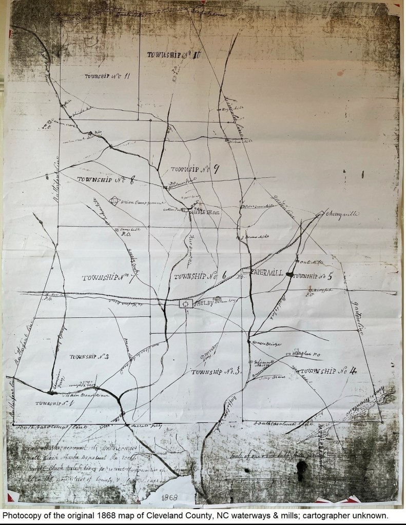 The county has several sizable creeks. For an article in celebration of Cleveland County’s first centennial, county historian Madge Webb Riley had this to say about the area’s water sources: