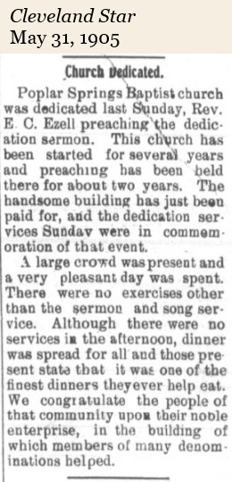 1898. Poplar Springs Baptist Church. On Wednesday, September 21, 1898, deacons and pastors from a number of churches met at Shanghai School for the purpose of organizing a church. The Reverend Tom Dixon presided over the meeting. The church has constructed a number of buildings since its organization. A wooden structure in 1899, a brick structure in 1929, a sexton’s home in 1947, an educational plant in 1954, a parsonage in 1956, and a new sanctuary, recreation facilities, pastor’s study, office and classrooms were completed in 1970. History and map.