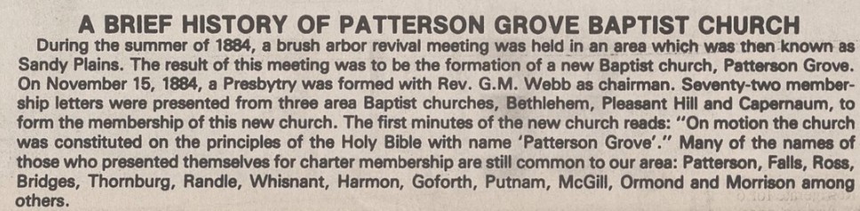 1884. Patterson Grove Baptist Church, Kings Mountain. Early members were John Barber, B. Goforth, L. M. Logan, E. B. McSwain, G. P. Hambrick, E. Hardin, R. U. Patterson, Noah W. Ross, R. Y. Weathers, and G. M. Webb preached the first sermon. Source: Norman Webster; pg. 47, The Heritage of Cleveland County, 1982. Church website. Map.