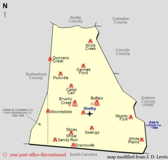 Cleveland County currently has two cities, 13 towns, and one census-designated area. Since the formation of Cleveland County in 1841, some towns have formed and lasted until now, while others have changed names over time. Still others formed and became extinct. The Heritage of Cleveland County, Vol. 1 (pg. 25) provides a summary of Cleveland County towns with post offices. Below is a map of the county as it was between 1841 and 1850.
