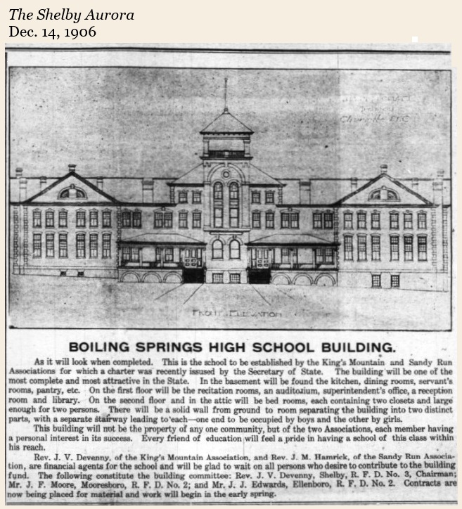 Gardner-Webb began in 1905 as Boiling Springs High School through a partnership between the Kings Mountain and Sandy Run Baptist Associations. It was to be a boarding high school designed to offer a Christian influence. Planning for a new building began in 1906.