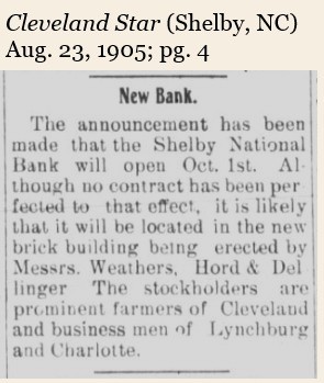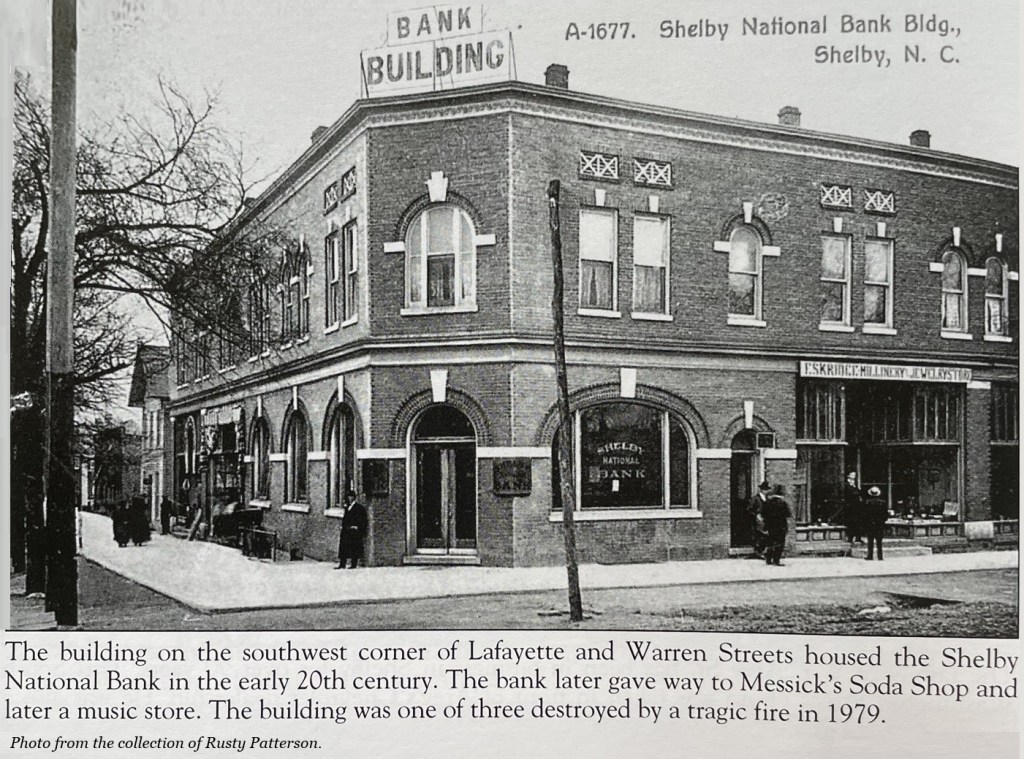 A second bank began operations in Shelby in October of 1905. The Shelby National Bank was located on the SW corner of Lafayette and Warren Streets. This beautiful building was built by brothers-in-law Albert P. Weathers and Cletus T. Hord, and Burgin (?) Dellinger.