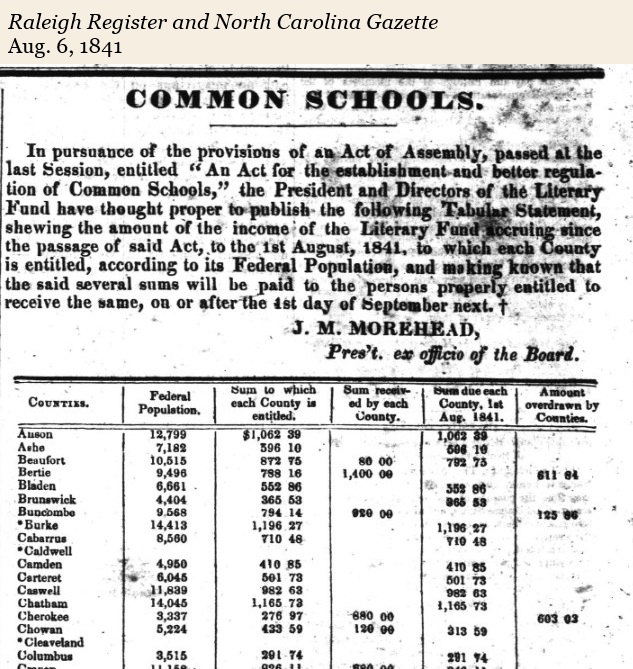 The Education Act is passed by the General Assembly; it is revised in 1841, creating North Carolina’s earliest public school system. The state’s first “common” school opened in Rockingham County in January 1840.