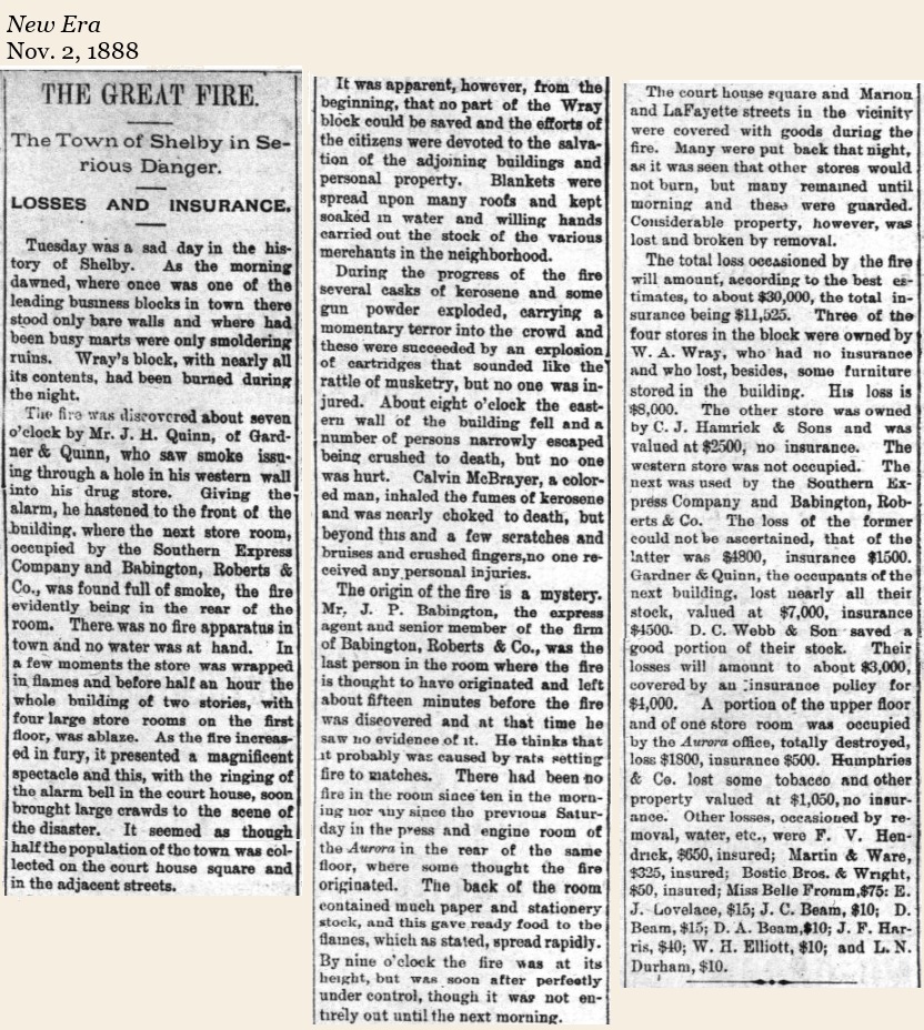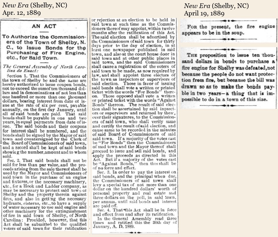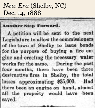 In the fall of 1888, three destructive fires in Shelby led to citizens signing a petition asking the state legislature to allow the town of Shelby to issue bonds for the purchase of fire equipment.