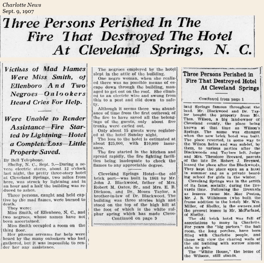 The Cleveland Springs Hotel, built in 1868 to replace the first hotel at the Wilson Springs site, burns. Three people perish.