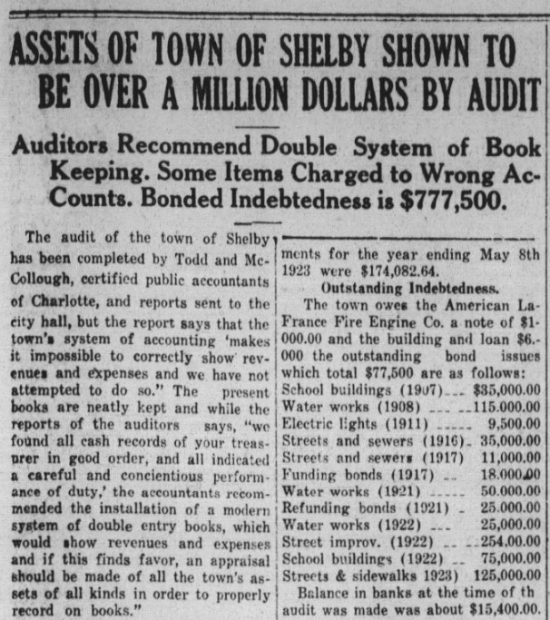 A 1923 audit of the town of Shelby includes a line item of outstanding debt to the American LaFrance Fire Engine Company of $1000.