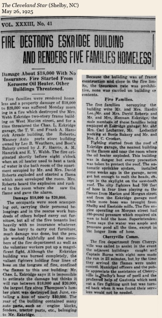 Six are killed in a house fire five miles north of Shelby. The following day, after having assisted in that fire, Fallston Volunteer Fireman Carl A. Beam dies from a heart attack soon after working a second fire.