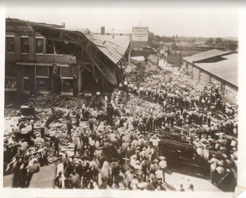 This photo of the collapse was apparently taken from an upper story window in the Central Hotel looking south across West Warren Street. The Gardner Building is damaged; the McKnight Building has collapsed. Photo by Forrest Ellis. October 15, 1929