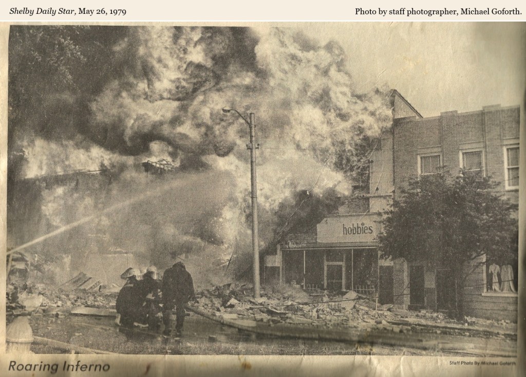 A fire and explosion destroys several buildings on West Warren Street in Shelby. Four firemen and a city gas utilities employee are killed. Later, arson is found to have been the cause.