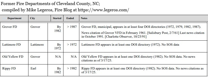 The timeline below includes large fires and notable events that took place in the history of Cleveland County with regard to fire and rescue.