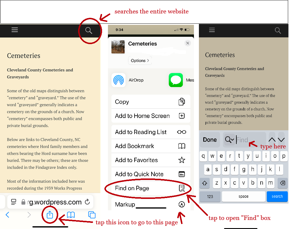 From an iPhone page, click on the share button at the bottom. Scroll down to “Find on Page” and enter the name or word you’re searching for.