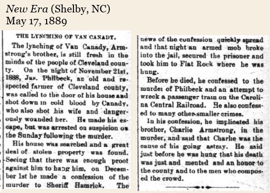 Cleveland County farmer James Philbeck and his wife are shot by Van Canady; Mr. Philbeck died; his wife was seriously injured. Canady is apprehended and confesses to the crime. He was lynched by an angry mob on December 1.