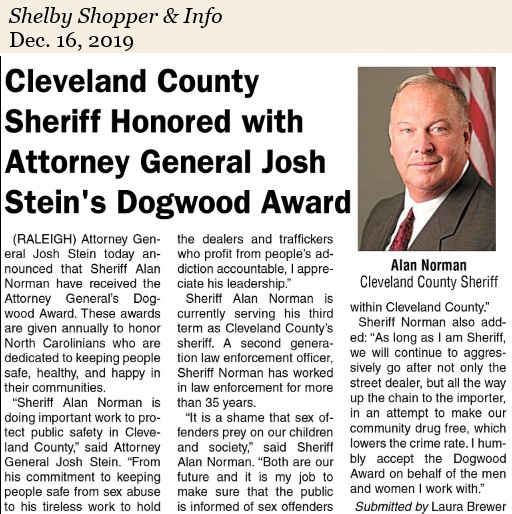 Sheriff Alan Norman receives the state Attorney General’s Dogwood Award, an annual award created in 2017 by North Carolina Attorney General Josh Stein to recognize individuals and organizations dedicated to improving the health, safety, and well-being of their communities.