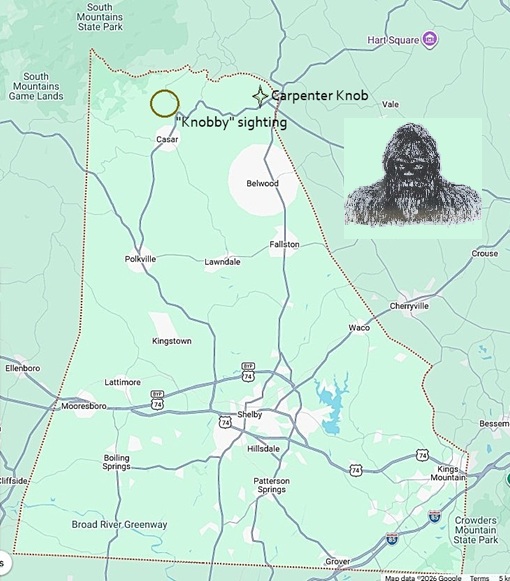 “In the winter of 1979, several residents around Carpenter’s Knob in Cleveland County, North Carolina, reported a series of unusual encounters with an unknown, apelike animal. Among the early sightings were those reported by Minnie Cook, an 88-year-old resident who claimed that she observed the animal after she emerged from her home to learn what kind of animal had been disturbing her dogs.