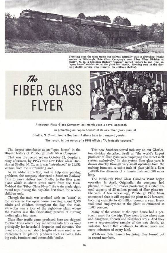 PPG (Pittsburg Plate Glass) broke ground on a fiberglass plant in the Washburn Switch area of Cleveland County in 1958. A year later, it celebrated its opening by inviting the public in to tour it. A chartered train brought numerous people from the depot in Shelby to the plant. Many Baby Boomers remember the train ride and tour.