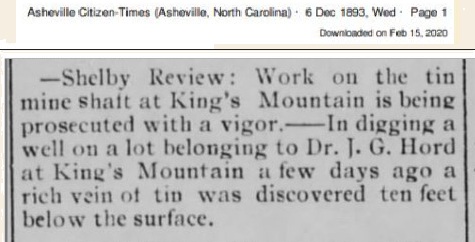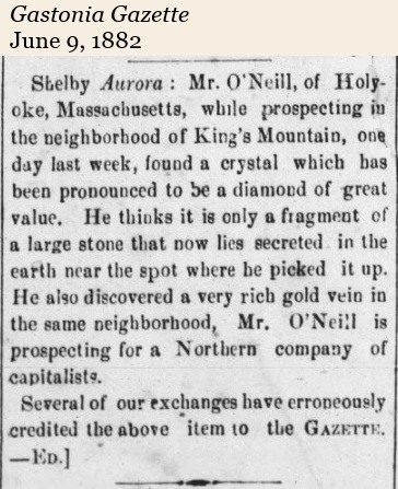 Gold was first discovered in 1834 by Mary Briggs in a spring near her home in what is now Kings Mountain. Her discovery resulted in a “gold rush” in what would ultimately result in a million dollar gold mine. Gold was sporadically mined in the late 1800s and early 1900s. The last significant production was from 1954 to 1963 as a byproduct of copper mining.