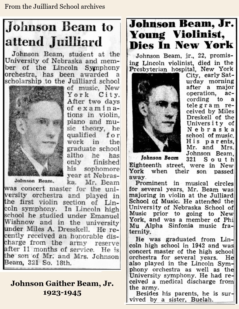 Johnson G. Beam, Jr. learned to play the violin at an early age. News and reviews of his recitals and performances were in the news on a regular basis. At Lincoln High School (NE), he rose to concertmaster.