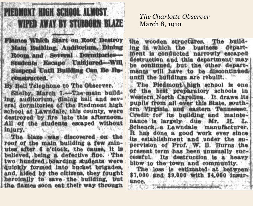 - Forney, Sr., Thomas Jacob. “Old Piedmont High School at Cleveland Mills: Remembrances of Frances Ramseur Forney.” The Lawndale Historical Society, n.d. http://www.lawndalenc.org/Piedmont01.html ↩︎