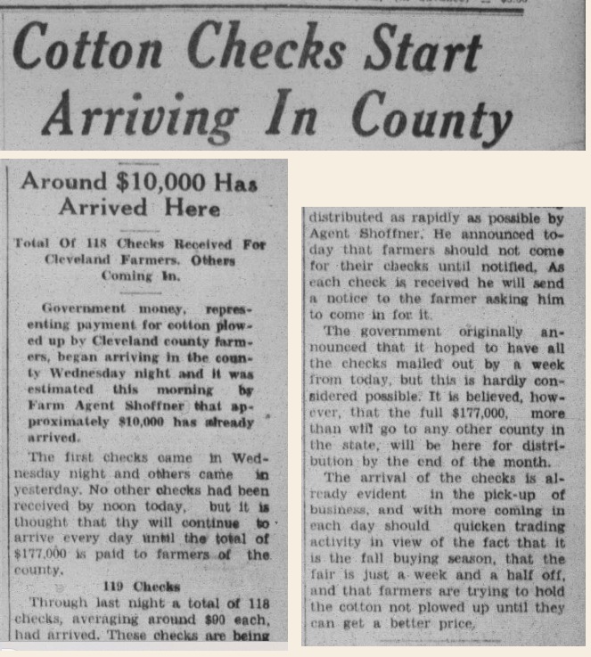 - 1920s: In the early part of the decade, Cleveland County grew nearly 75,000 acres of cotton; about 8,000 bales produced per year. By the end of the decade, 80,000 bales were produced per year.