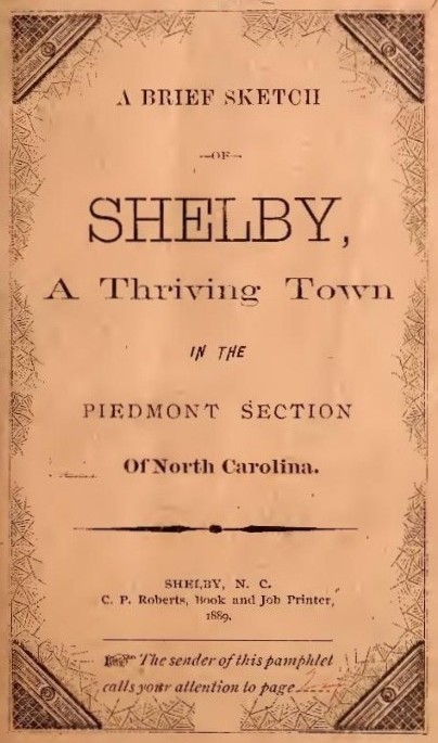 Two booklets have been found in the North Carolina archives that promote the city of Shelby around the turn of the 20th century. One was “A Brief Sketch of Shelby: A Thriving Town in the Piedmont Section of North Carolina.” Clarence Frick collected material for the pamphlet which was published in 1889 by C. P. Roberts, Printer.