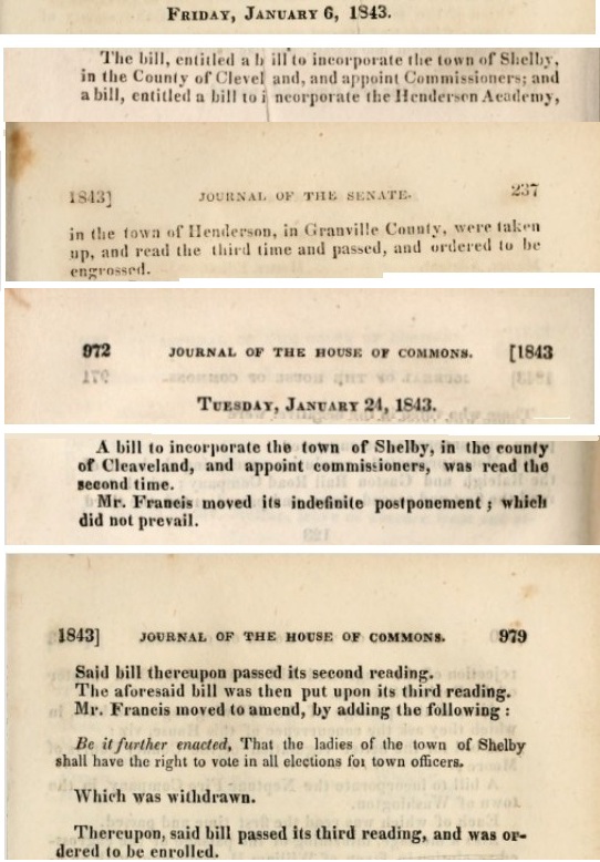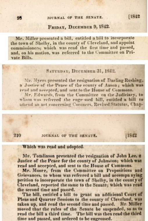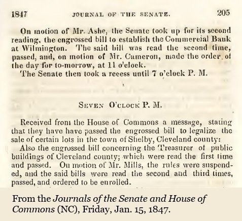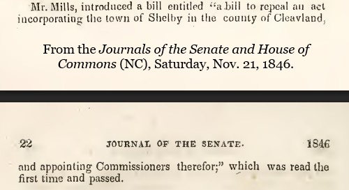 - Three years after Shelby was incorporated, a bill was introduced to the NC State Senate to repeal the act of incorporation; it passed and was sent over to the NC State House of Commons where it passed the following year. Cleveland County historian Robert S. Gidney conducted research into the reason for the repeal of the city’s charter. Writing in Our Heritage, he states, “It appears that the town of Shelby did not immediately exert any governmental authority and the citizens decided to ask the General Assembly to revoke the charter.”