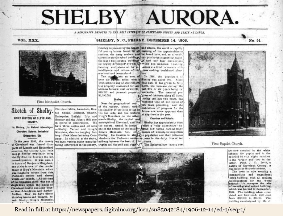 On December 14, 1906, The Shelby Aurora published a special edition highlighting the history and progress of the city of Shelby. It can be read in its entirety at DigitalNC.