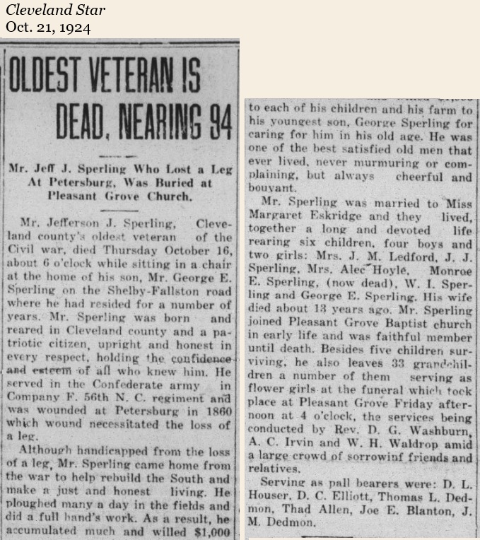 John Jefferson Spurling was Cleveland County’s oldest Civil War veteran. He died in 1924.
