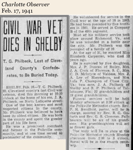 Thomas Goode Philbeck was Cleveland County’s last surviving Confederate veteran. He had served with Company B, 49th NC Infantry Regiment and was wounded on May 10, 1864 at Drewry’s Bluff in Virginia.