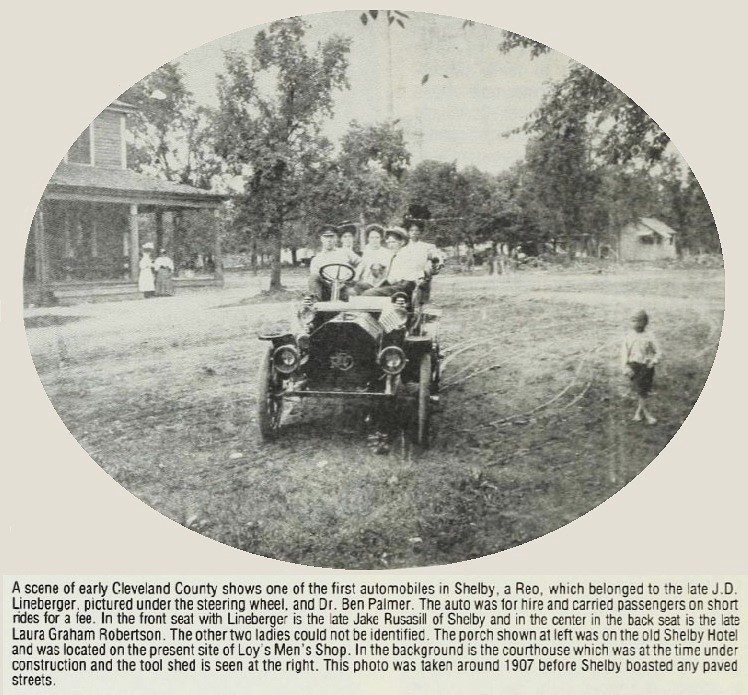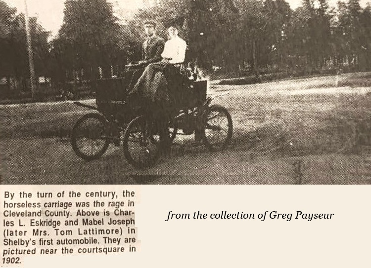 According to Our Heritage, the first person to buy a car in Cleveland County was Joe C. Smith of Shelby in 1902. He was followed by W. T. Carlton of Lattimore, who reportedly bought a Jewell.
