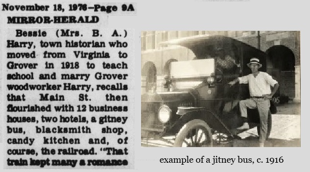 In Grover, a jitney bus operated to shuttle people around. The photo below is not the actual one in Grover, rather it is an example of a jitney bus. (The article misspells the word as “gitney.”)