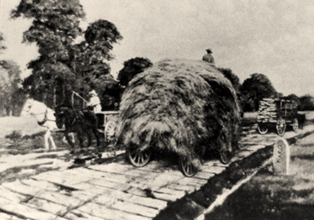 In pioneer days, the first “roads” were little more than dirt bridle paths or wagon trails that had evolved from Indian trails–which in turn had evolved from buffalo traces and deer trails. These roads alternated from dusty to muddy depending on the rainfall and could make travel very difficult.
