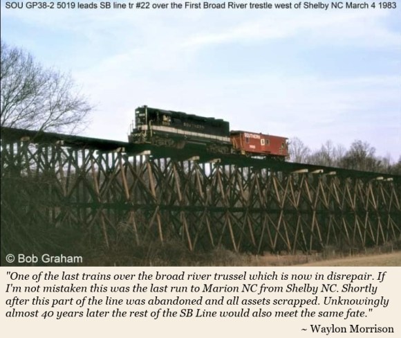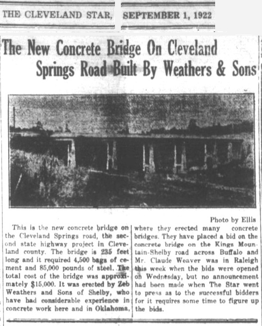 After Cleveland County was formed in 1841, $125 was spent to build a bridge at Elliott’s Ford, an ancestor of the present-day US-74 West bridge across the First Broad River. (The ford had been named for Revolutionary war veteran Martin Elliott whose grave is on the hill on the north-west corner of the intersection of Hwy. 74 West and Polkville Road. His grave site was reportedly his rose garden at the time of his death in 1832.)