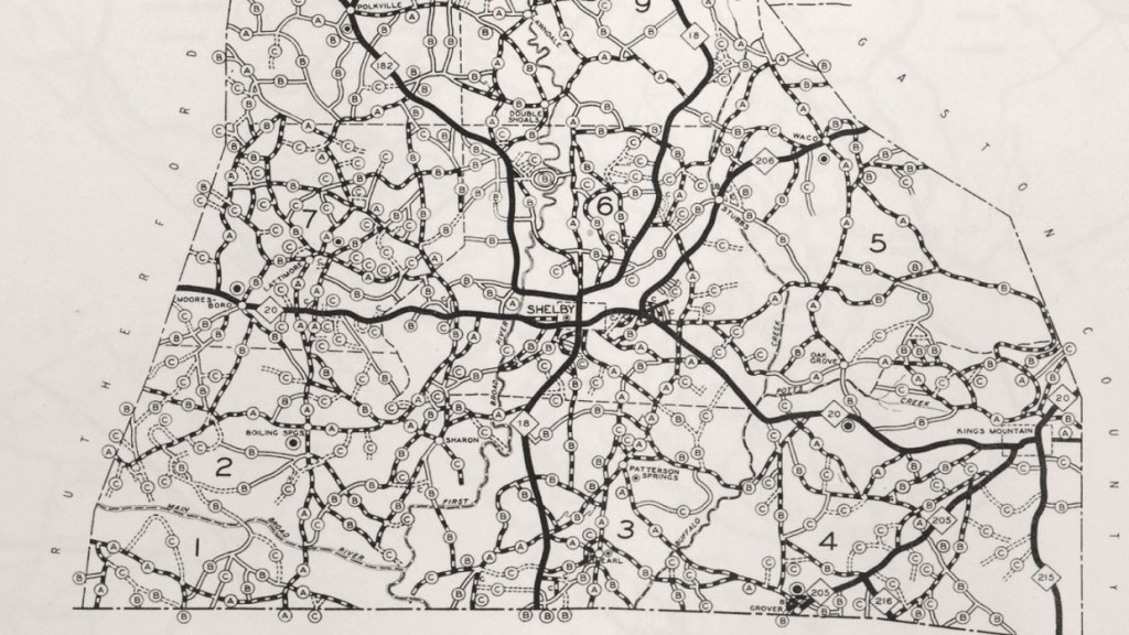The image below shows a section of the road survey map in 1930. Notice the original road that is now Hwy. 74 Business (Marion Street in Shelby) was formerly Hwy. 20. Hwy. 150 to Cherryville was formerly Hwy. 206, and Hwy. 226 toward Polkville was Hwy. 182. The full, interactive map is here.