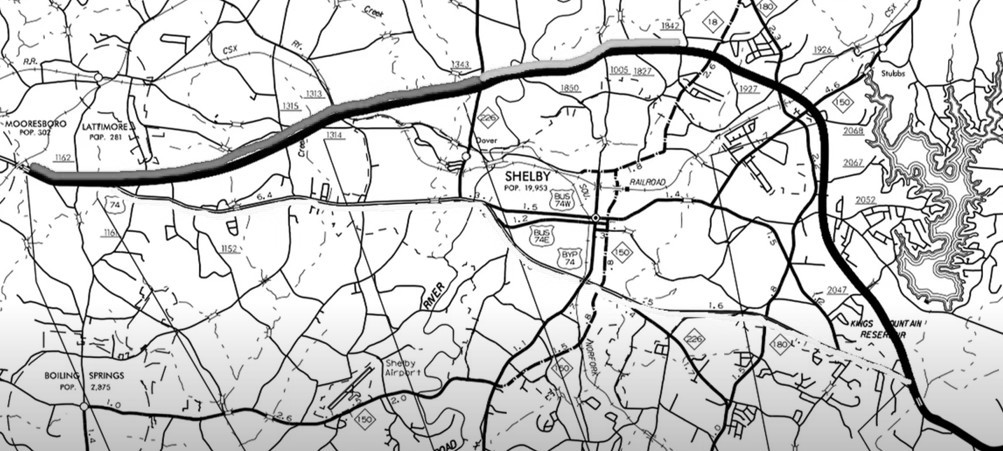 In the 1970s, planning began for a bypass around Kings Mountain. It was completed by 1983 and named for NC Senator John Ollie Harris of Kings Mountain. The Hwy. 74 bypass around Kings Mountain was constructed by interstate standards; the Hwy. 74 bypass around Shelby was not. So many businesses built along this section of highway that eventually a “bypass around the bypass” was needed. Shelby’s stoplights had become the only stops from Charlotte to Los Angeles, CA. Currently a US Hwy. 74 bypass north of Shelby remains under construction. This project began on the west side, near Mooresboro, in July of 2013. The section from there to the new Hwy. 226 interchange was completed in 2018. The section from the 226 interchange to the Hwy. 18 interchange to the Hwy. 150/180 interchange began in 2017 and opened to traffic on June 17, 2025. The final 4.1 mile segment from Hwy. 180 to Hwy. 74 on the east side began in 2023 and is projected to be completed by 2029 (although Congressman Tim Moore said in a statement on June 18, 2025 the segment “should open in a couple of years.”)