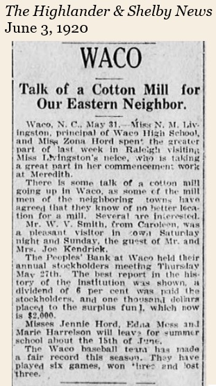 The area that is now Waco was settled in the early 1840s when it was still part of Lincoln County. Its first church was established as Capernaum Baptist Church in 1842–the first church to be established in the newly formed Cleveland County–in a location about three miles from the main road.