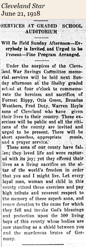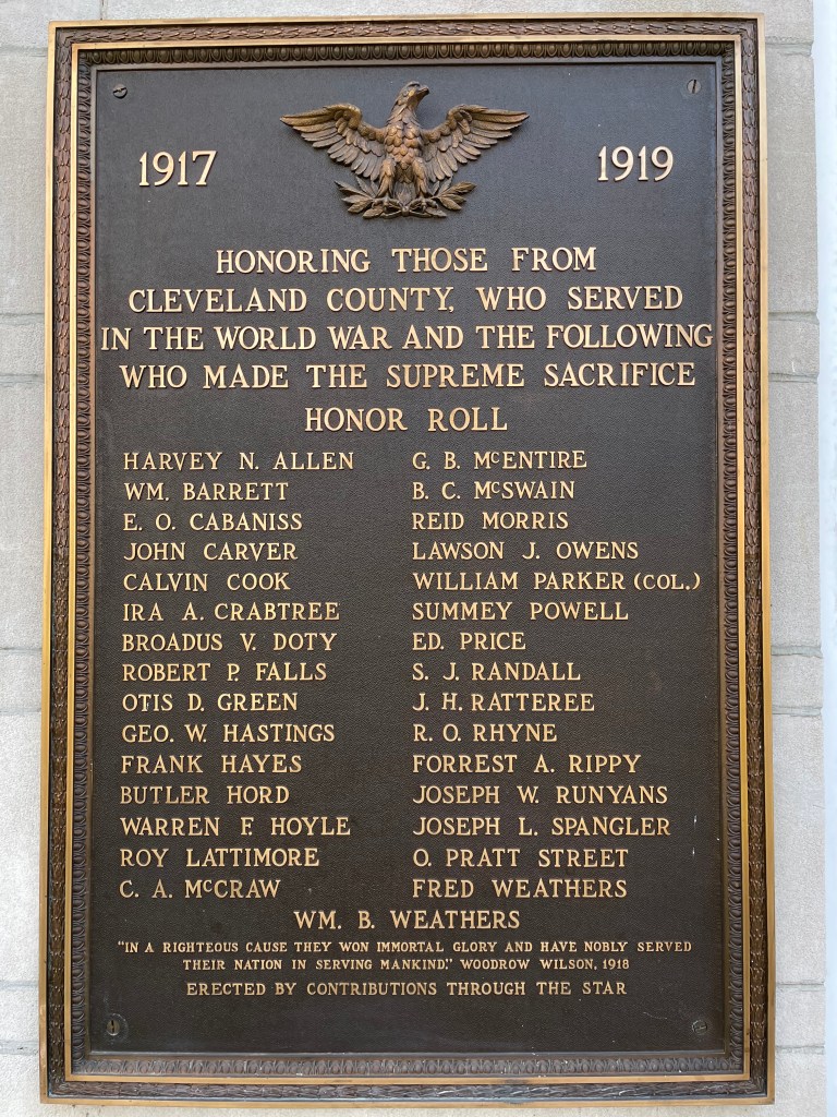 Some 700 men from Cleveland County enlisted for service during World War I. Two dozen of these became officers.